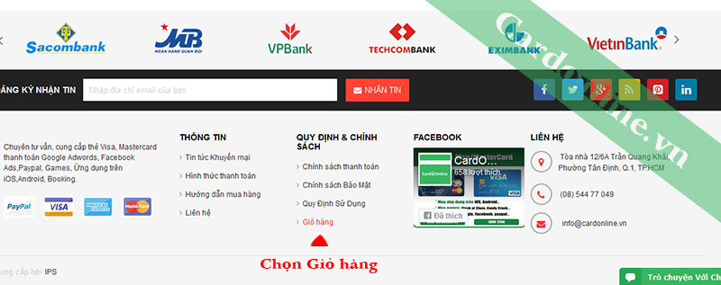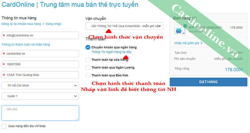3. Thanh toán: Chọn hình thức thanh toán. Nếu chuyển khoản qua NH, bạn nhấp vào " Thông tin Ngân Hàng tại đây" để được cung cấp thông tin các Ngân Hàng bên Cardonline.vn